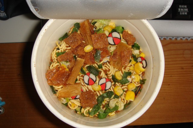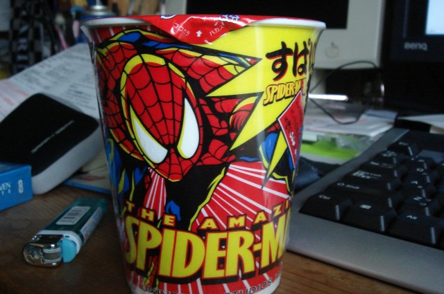 中身は普通のカップヌードルですが、かまぼこがスパイダーマンなのだ。