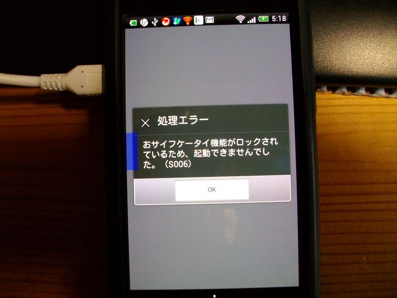 おサイフケータイ機能がロックされているため、起動出来ませんでした。(S006)