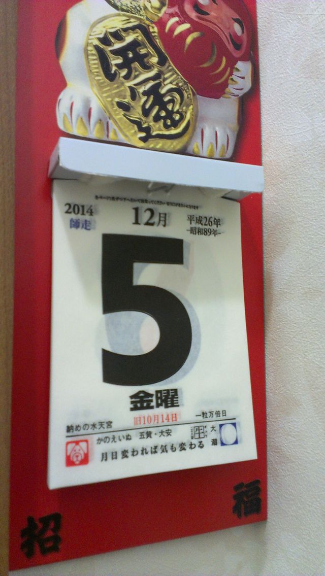 日めくりカレンダー 投稿日: 2014-12-05 05:37 愚呑 毎年、トイレ用に日めくりカレンダーを購入します。 めくるのはトトロの仕事なのですが、薄くなりました。 平成26年の下に昭和89年と記載されているので、昭和換算するのに便利なのです。 格言やら各地の行事なども書かれています。 スマホにも同じようなアプリがありますが、やはり、いつもの場所で目に止まるのがアナログの良さですね。 📂投稿グループ 日々楽々