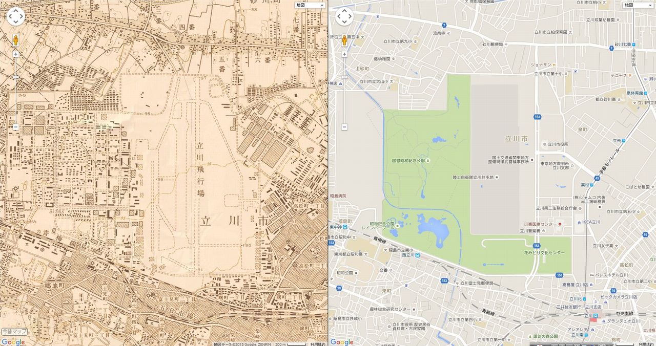 左・飛行場当時のマップと現在、陸自はマップでは表示されませんが、Googleアースでは確認出来ます。