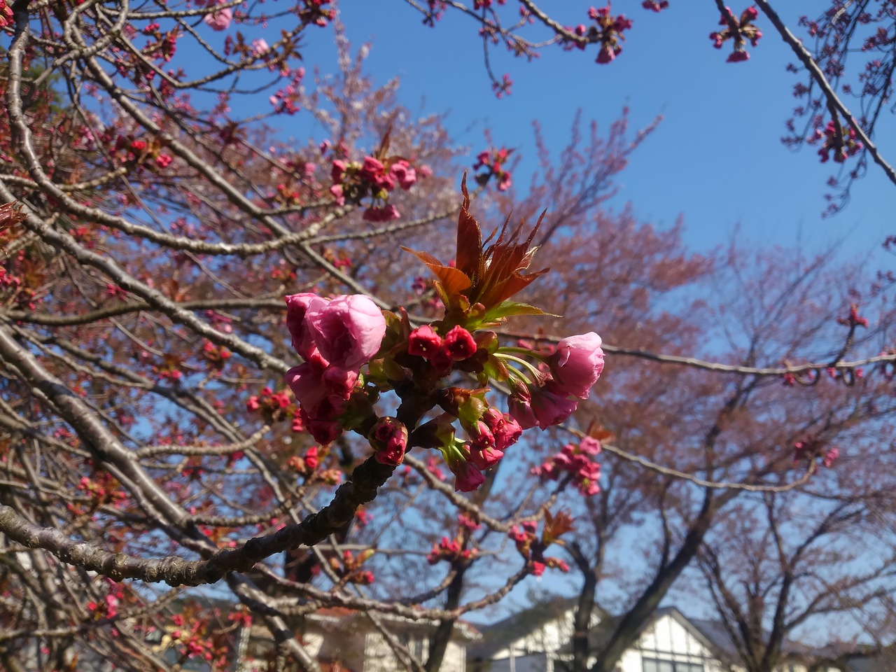 八重桜が開き始めました。