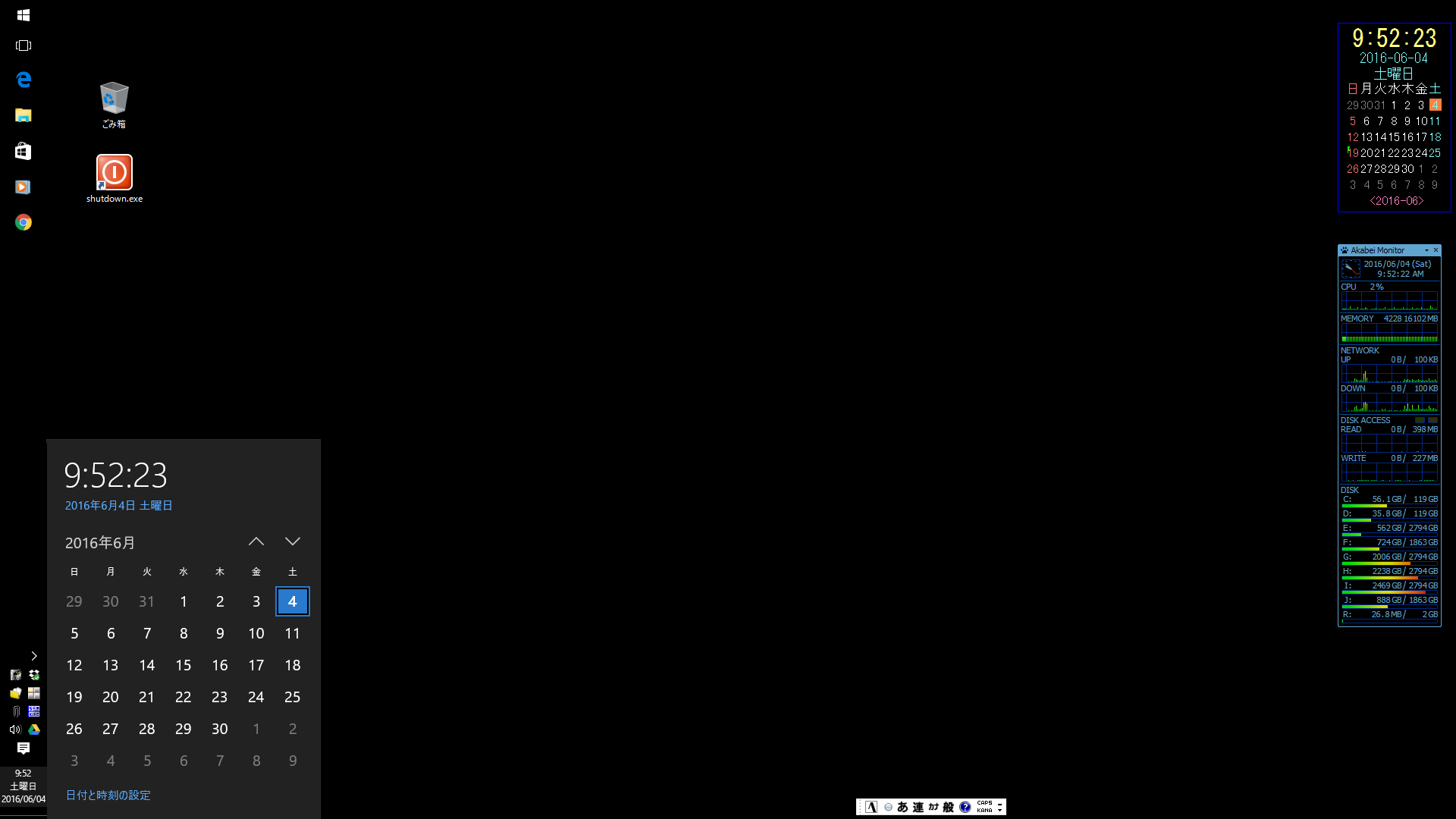 タスクバーは左に立ててあります。時計にマウスを置くと年月日で表示されます。