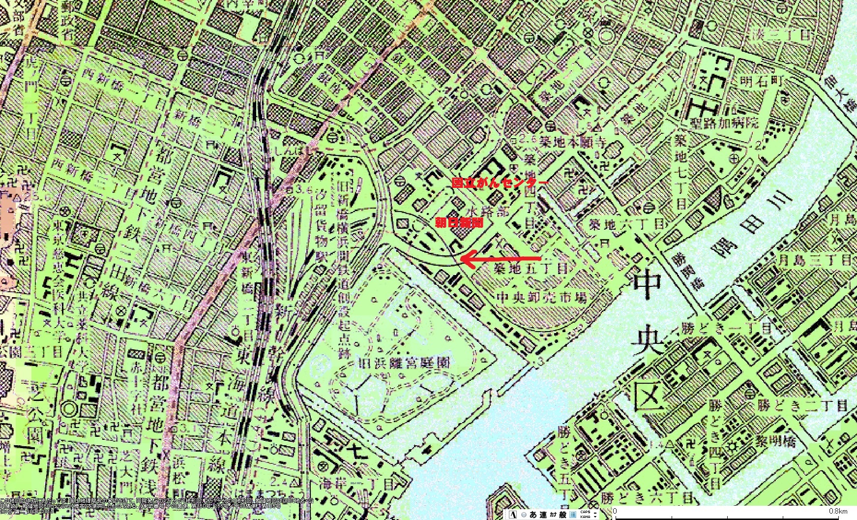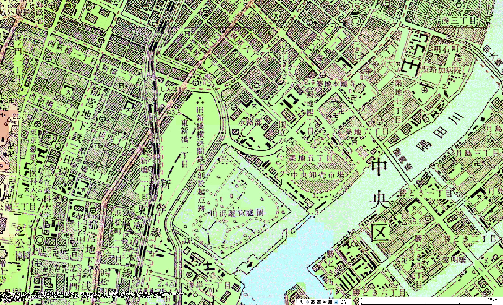 築地市場への引込線、気になって記憶を蘇らせたら、確かカーブのところに線路があった様な気がして、今昔マップと言うツールで年代毎の古い地図を見てみました。