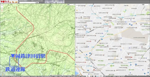 赤ラインが演習線、青ラインは現在の道路です。