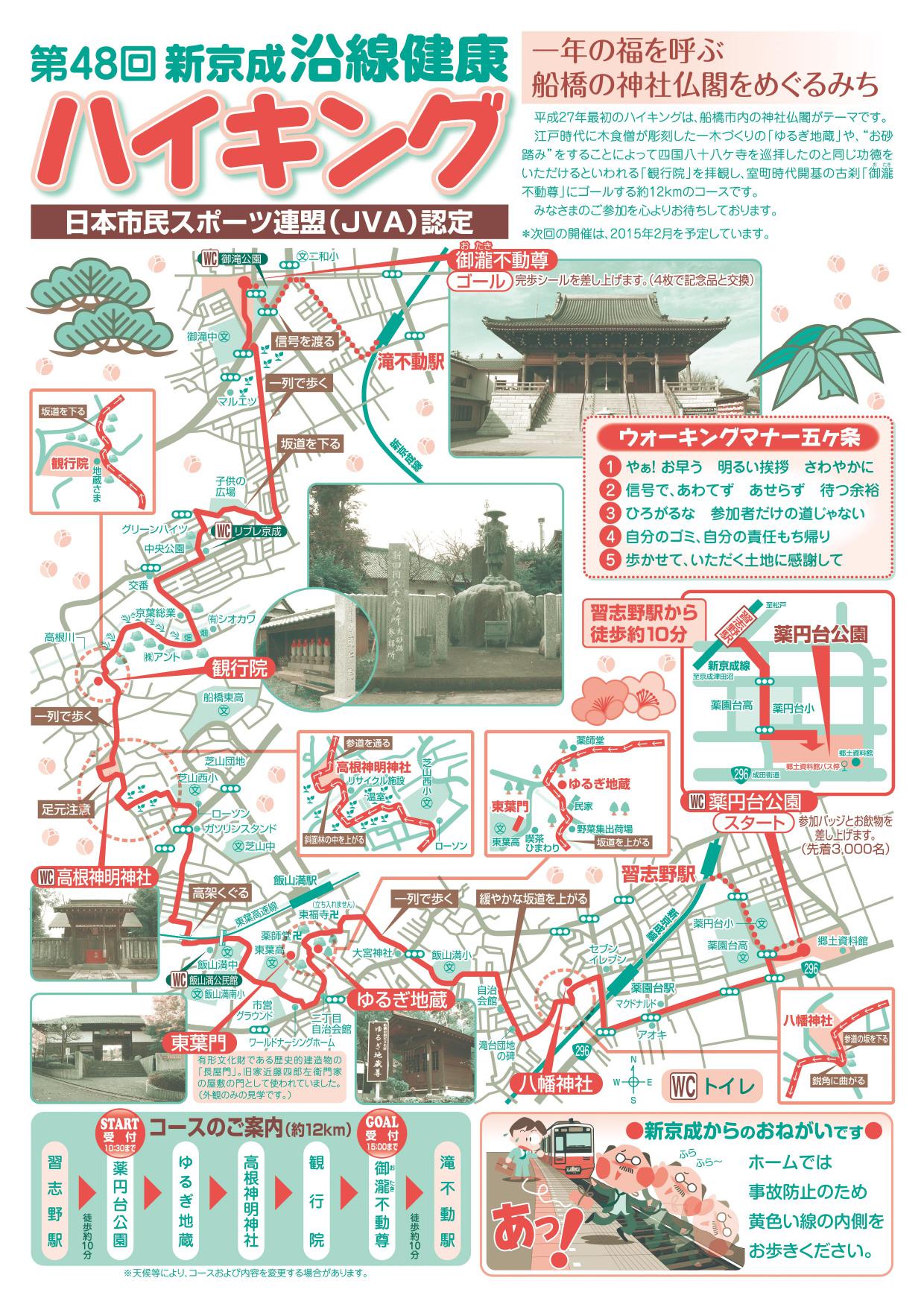 新春初歩き 投稿日: 2017-01-05 17:15 愚呑 平成29年も始まり、酒ばっかり飲んでいるわけにはいかず、初歩きに出掛けました。 近い(自宅から1時間くらい)、交通費(往復千円以下)が掛からない、往復の電車が混まないの3点が揃った新京成沿線ハイキングです。 一年の福を呼ぶらしいので、これしかないですね。 関東地方は良いお天気が続いています。 10時にもなると、通勤通学も終わり、ホームもガランとしています。 八幡様です。日の丸も揚がり、目出度いです。 大宮神社、大宮ではありません。習志野にある大宮神社です。 東葉門とか言う大きな長屋門。東葉高校の門です。 ゆるぎ地蔵さんです。 途中、畑の中から富士山が新年の挨拶をしてくれました。 高根神明神社。特に松の内と言う雰囲気はありませんでした。 観行院と言うお寺さんにも寄りました。 駅名にもなっている御滝不動尊。昨年10月にも訪れました。 昼過ぎから冷たい風も吹き付けましたが、無事に新春初歩きを終えることが出来ました。 📂投稿グループ 日々楽々 駅から散歩