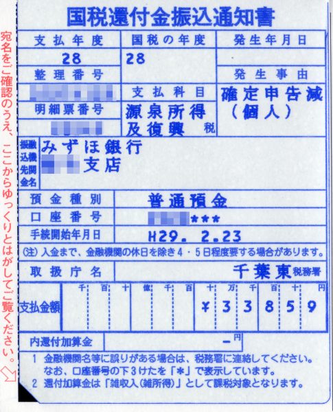 管轄税務署から還付振込通知書が届き、3万円強も還付されることになりました。