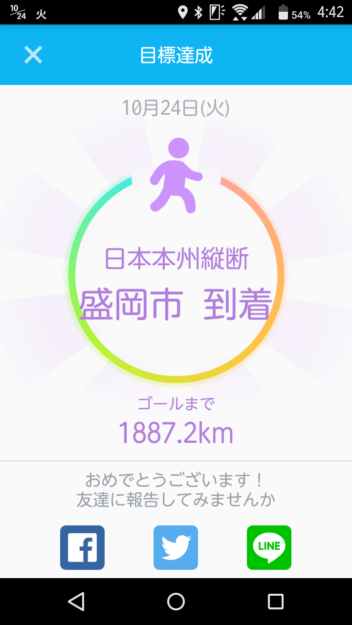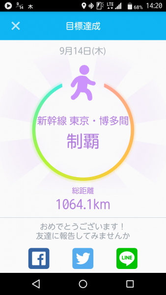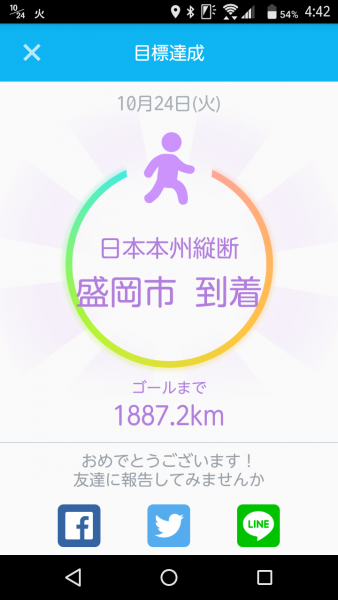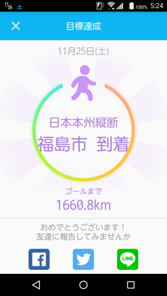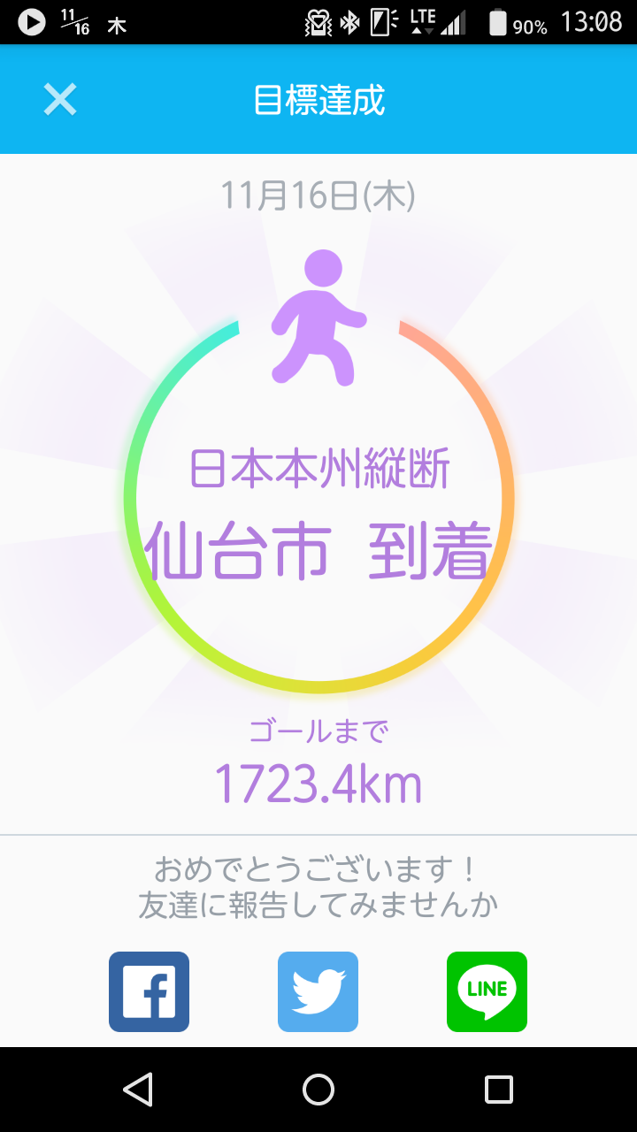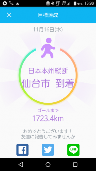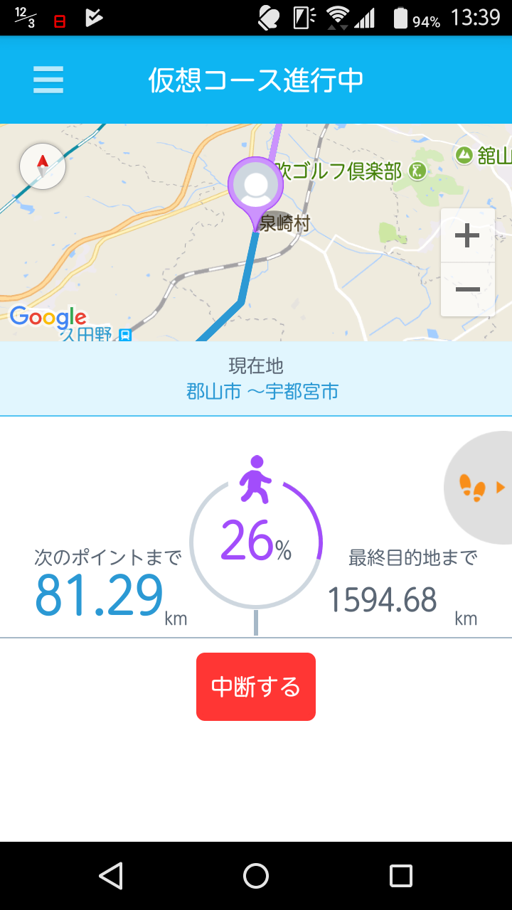 年内は何処まで? 投稿日: 2017-12-03 13:57 愚呑 スマホの万歩計で仮想ウォーキングコースを歩いています。 9月14日に新幹線での東京ー博多間コースを制覇しました。 そして、最長距離はどれだと始めたのがこれ 本州縦断と表示されていますが、スタートは青森、ゴールは鹿児島ですね。 同日にスタートです。 盛岡到着が10/24 仙台到着11/16 福島到着11/25 現在宇都宮に向かっています。 泉崎(いずみざき)を歩いてますね。 年内に宇都宮は抜けると思いますが、東京は届かないかも? 📂投稿グループ 日々楽々