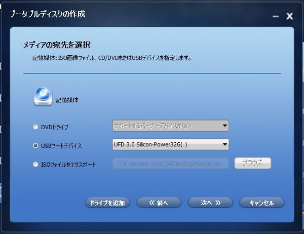 DVDドライブが2台もあるのに認識していません。ここで何を選択しても「次」には進みません。自分の環境ではここまででEND