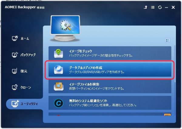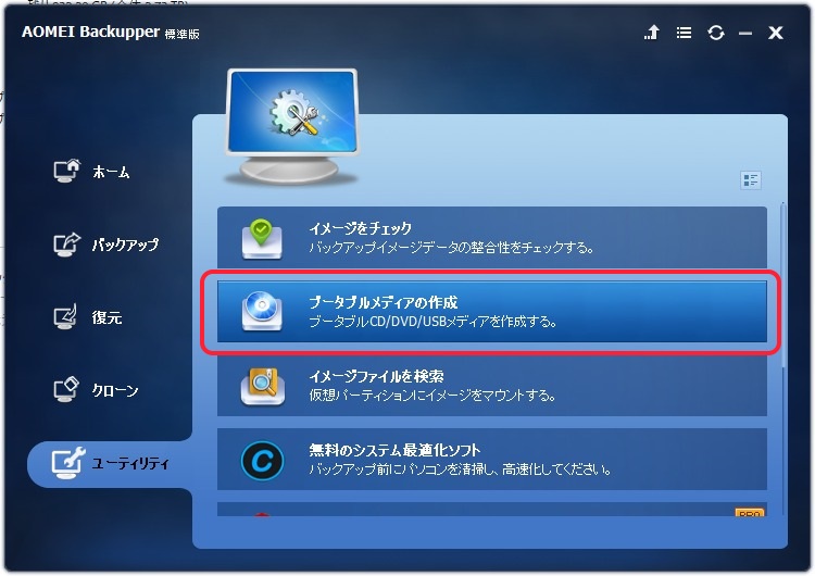 AOMEI Backupperの「ブータブルディスクの作成」を試みましたが、本記事の画像は出ず、以下の説明と同じ画面が出ました。