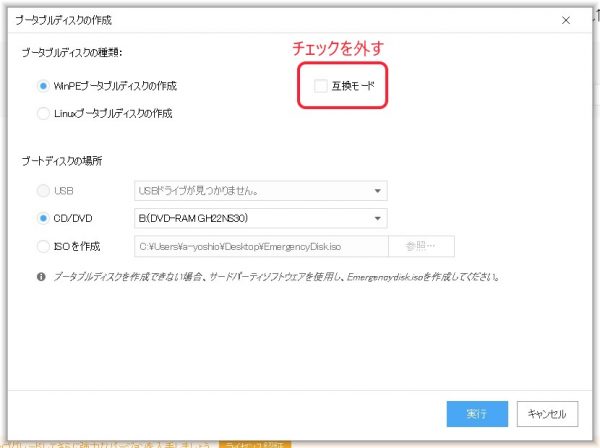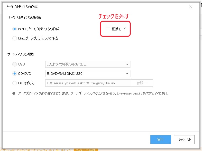 プータプルメディア作成の窓を開くと、標準で互換モードにチェックが入っています。