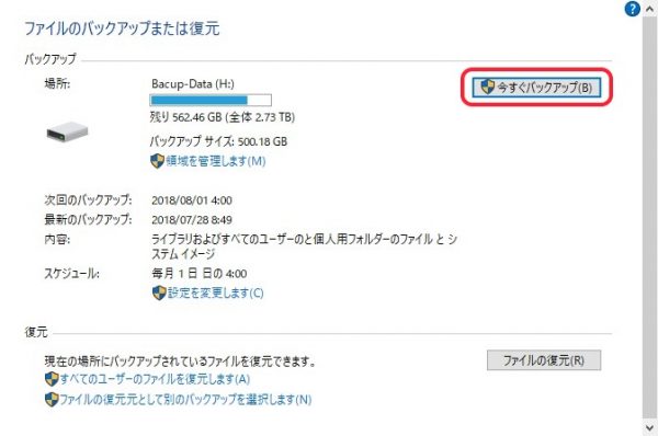 >通常、システムのバックアップは、たまにWindowsのツールでやっています。