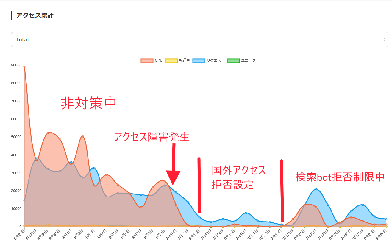 アクセス障害に陥って一時、国外からのアクセスを全面ストップしましたが、若干影響がありましたので、現在は不要検索botの締め出しをしている状況です。