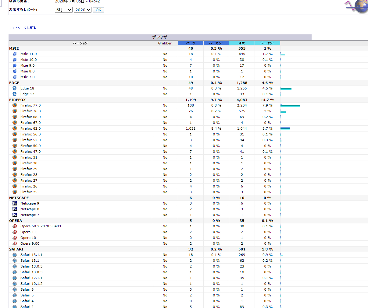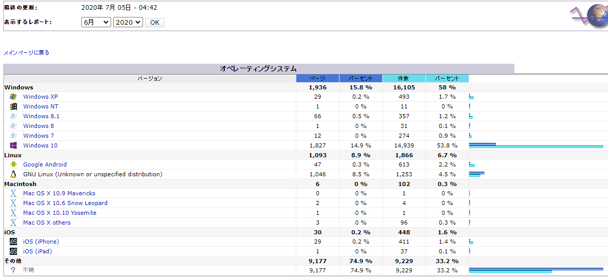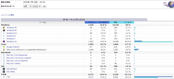 202006アクセス解析 投稿日: 2020-07-05 17:11 愚呑 ここを訪れた方のブラウザ比率 Edgeは苦戦ですね。 次はOSです。 まだXPなんて利用しているのは不思議だ。 📂投稿グループ ネット
