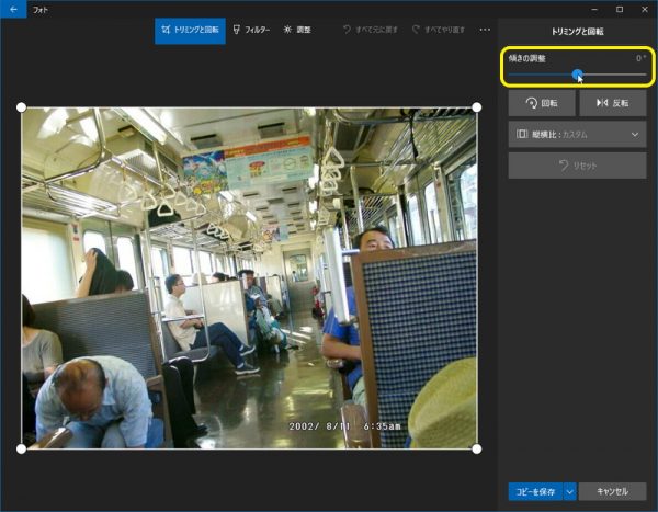 フォトでの傾き修正は自動ではありません。バーで修正角度を指示します。