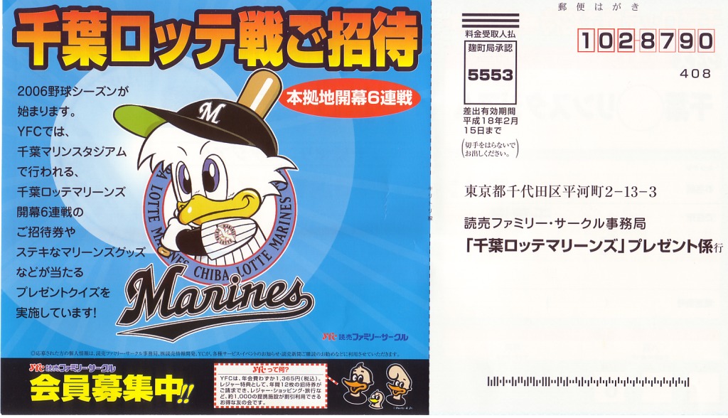 こんなハガキがポストに入っていた、讀賣がマリーンズを応援かよ。