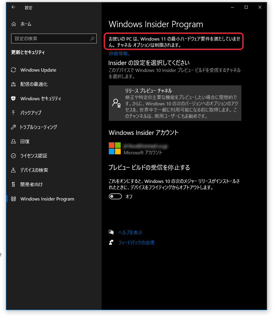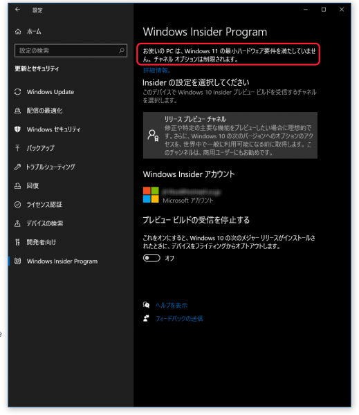 Windows insider Programの窓を開くと何時からか「あんたのはWindows11にならんよ」と表示がされています。