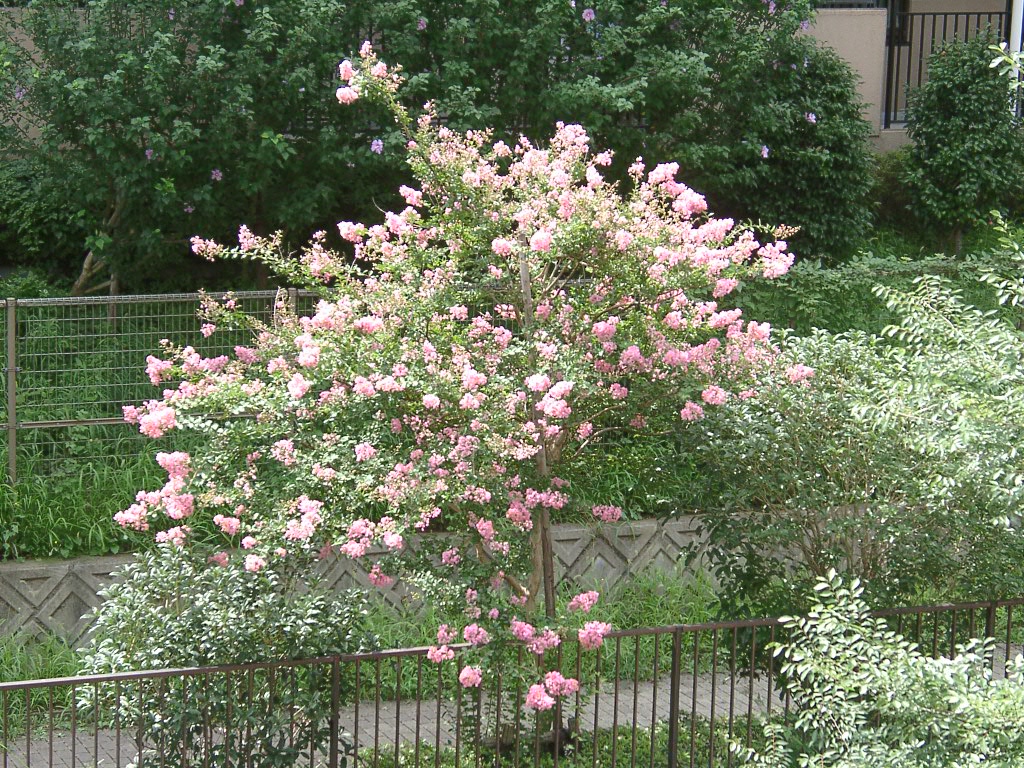 前の遊歩道はサルスベリが満開です。