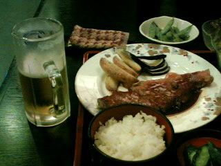 オニギリと焼きソバを買ってホームのベンチで食った。