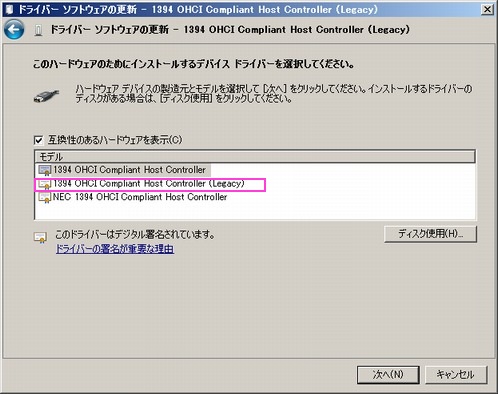 ”1394 OHCI Compliant Host Controller (Legacy)”を選択