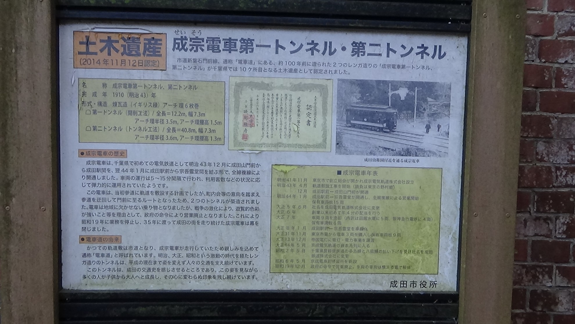まだ、新勝寺近くにはトンネルが残っています。宗吾霊堂近くには成宗電気軌道継続会社の千葉交通の記念碑が建っています。