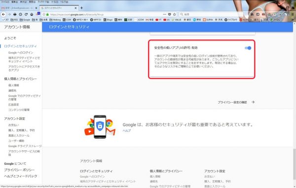 安全性の低いアプリの許可をONにしておかないとブラウザ以外はアクセス出来ません。