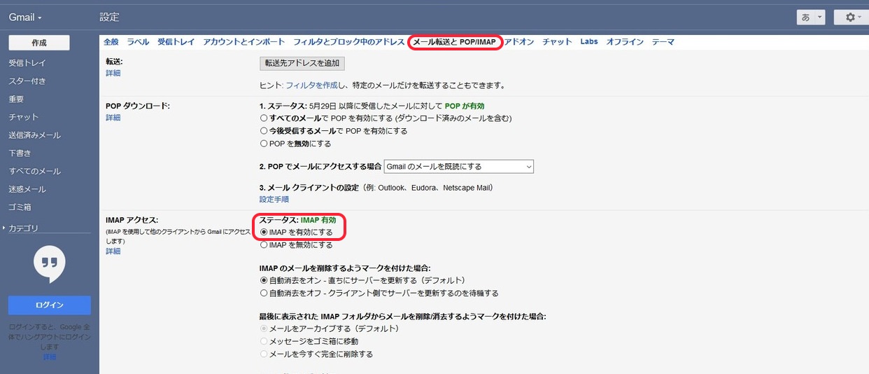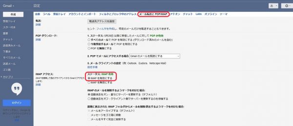 次にIMAP接続を有効にしておきます。
