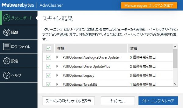 Adwareがあれば表示されるので、クリーニング&リペアをします。