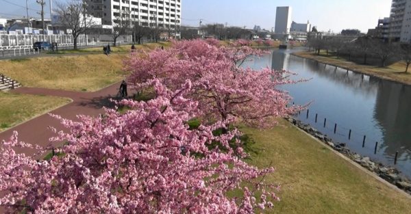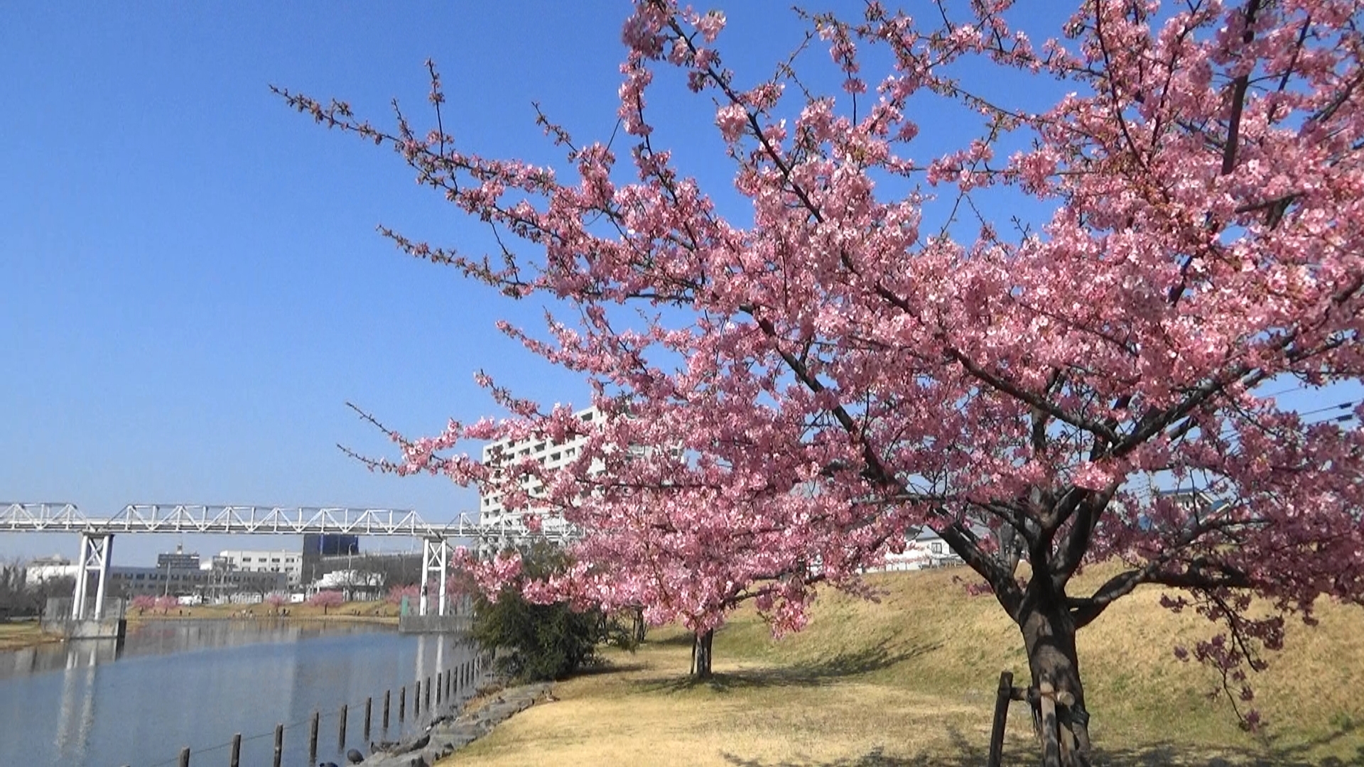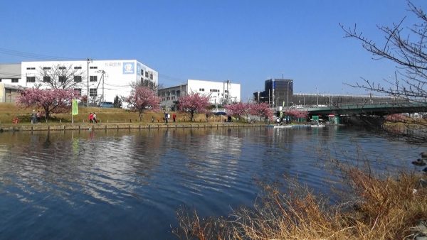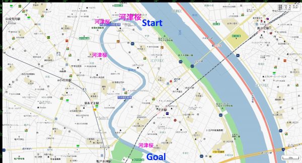 そんな平井駅から荒川と旧中川の合流地点から旧中川沿いを総武線ガードした過ぎまで歩いて、河津桜は二箇所です。