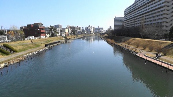 総武線ガードからふれあい橋までの200mくらいの間です。対岸には亀戸中央公園があります。
