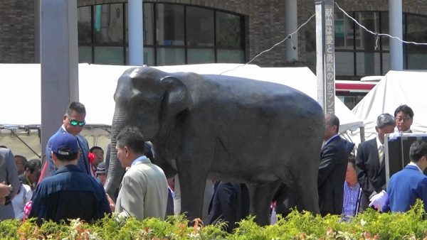 井の頭自然文化園で飼育されていて、昨年亡くなった象のはな子の銅像らしいものが見えます。除幕式があった様です。
