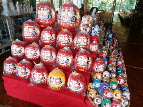 ぐるっと一周をし、観音山の頂上へ戻り、閑散としたお土産店から呼ばれたので、昼食にカレーを食べ、お土産に小さなダルマを購入しました。