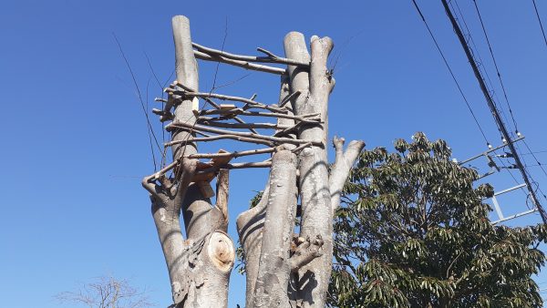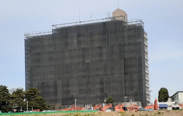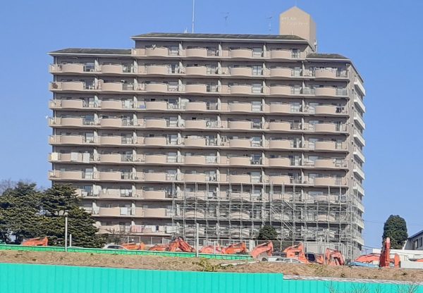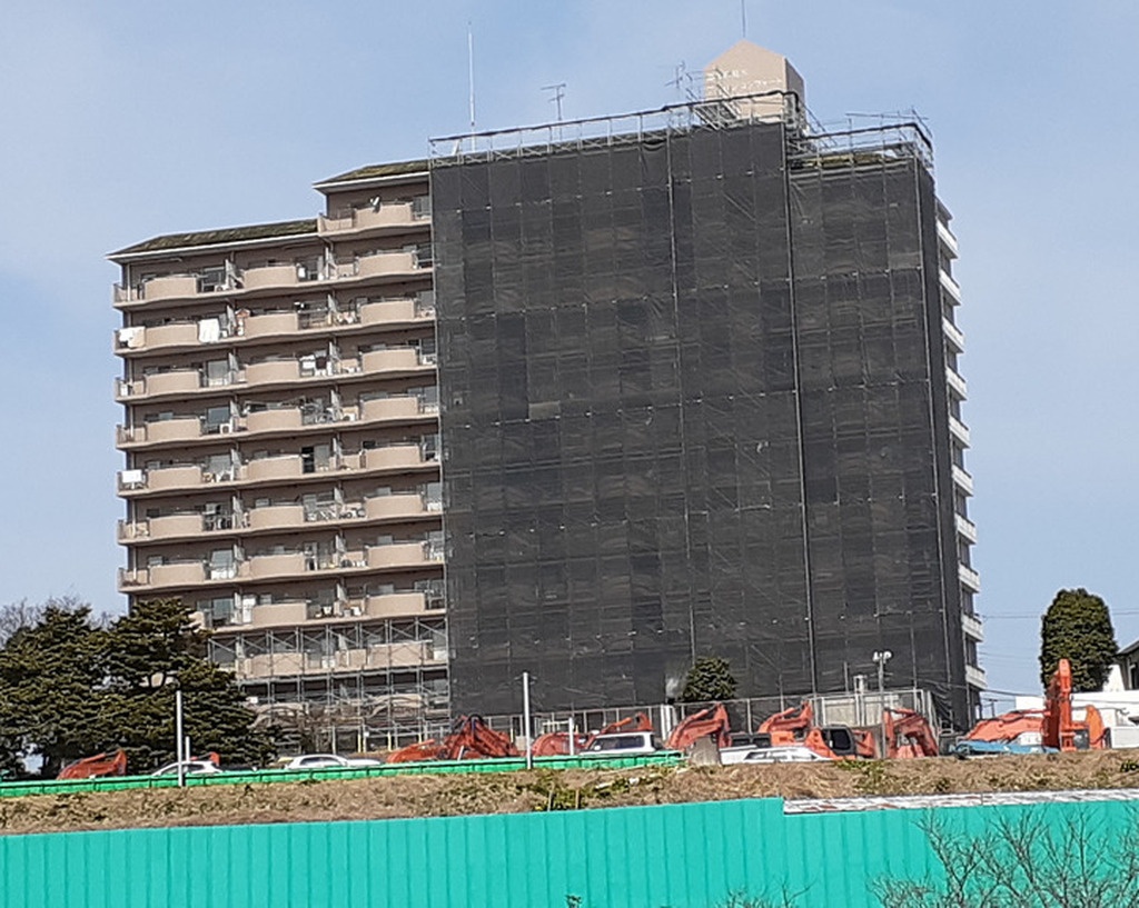 花見川遊歩道の川向こうに大きなマンションがあり、大規模改修工事が始まった様です。