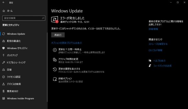 更新サービスがシャットダウンされたため、インストールを完了できませんでした。と表示されている。